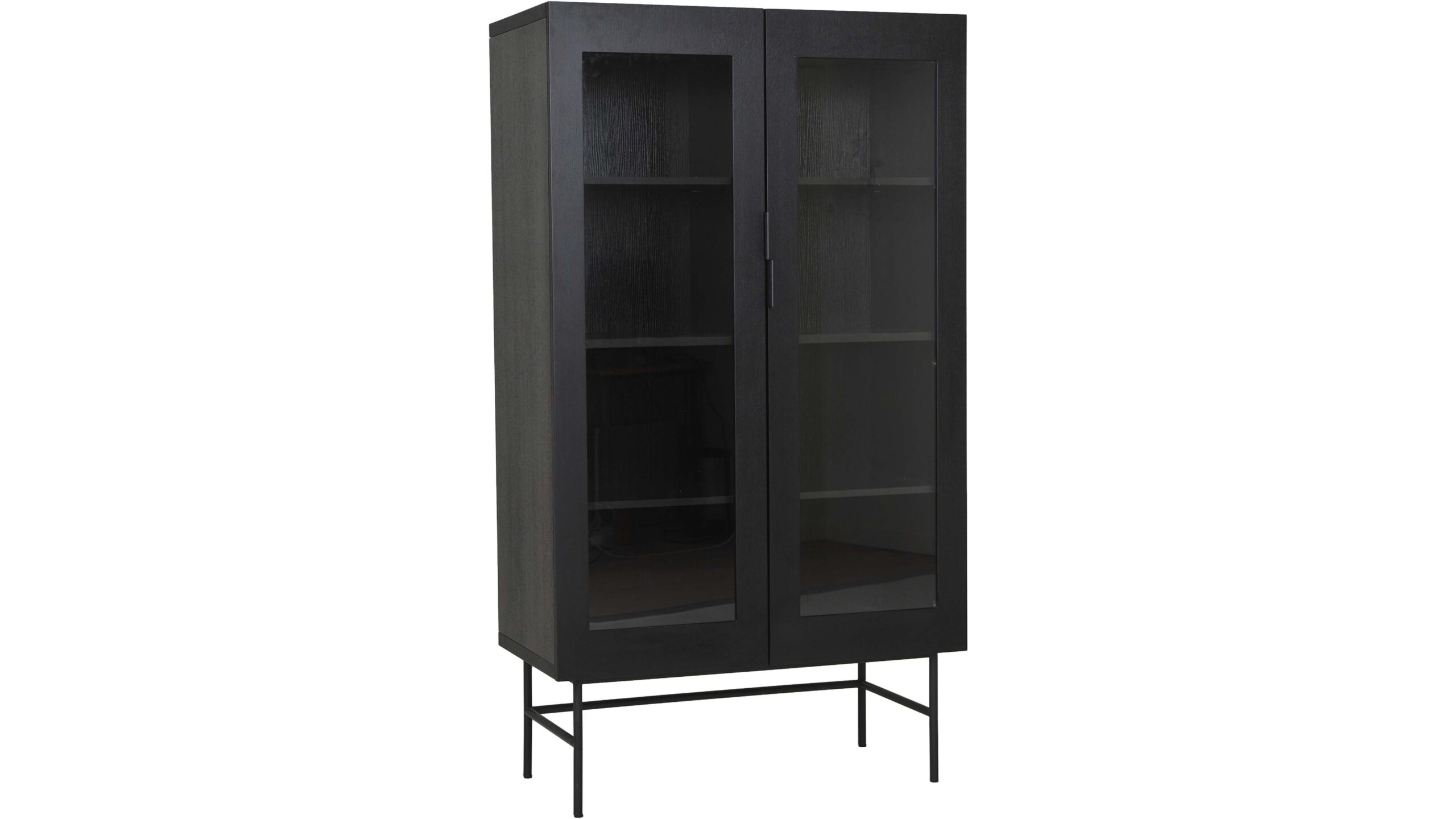 PARADE a-mobler | februari 27, 2026 PARADE vitrinskåp Svart askfaner med svart pulverlackerade metallunderrede 2 dörrar, härdat glas 47x95x170 (LxBxH)